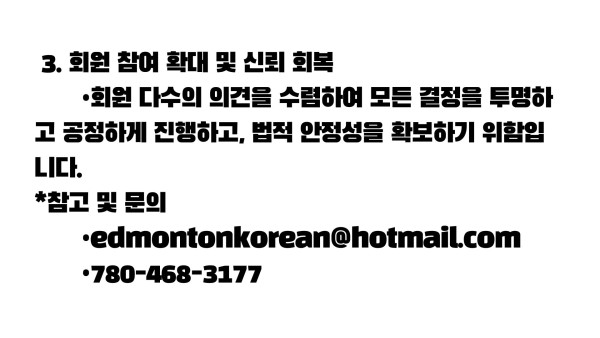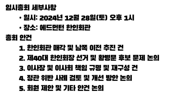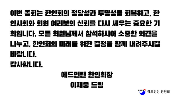 2024년 12월 28일 에드먼턴 한인회 임시총회 개최 작성자 정보 운영자 작성 작성일 2026.04.11 22:31 컨텐츠 정보 45 조회 목록 본문 SNS 공유 관련자료 링크 http://www.edmontonkorean.org/new/2024%eb%85%84-12%ec%9b%94-28%ec%9d%bc-%ec%97%90%eb%93%9c%eb%a8%bc%ed%84%b4-%ed%95%9c%ec%9d%b8%ed%9a%8c-%ec%9e%84%ec%8b%9c%ec%b4%9d%ed%9a%8c-%ea%b0%9c%ec%b5%9c/ 17 회 연결 댓글 0 등록된 댓글이 없습니다. 로그인한 회원만 댓글 등록이 가능합니다. 목록