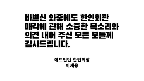 2024 한인회관 매각 관련 공청회 작성자 정보 운영자 작성 작성일 2026.04.11 22:31 컨텐츠 정보 20 조회 목록 본문 SNS 공유 관련자료 링크 http://www.edmontonkorean.org/new/2024-%ed%95%9c%ec%9d%b8%ed%9a%8c%ea%b4%80-%eb%a7%a4%ea%b0%81-%ea%b4%80%eb%a0%a8-%ea%b3%b5%ec%b2%ad%ed%9a%8c/ 8 회 연결 댓글 0 등록된 댓글이 없습니다. 로그인한 회원만 댓글 등록이 가능합니다. 목록