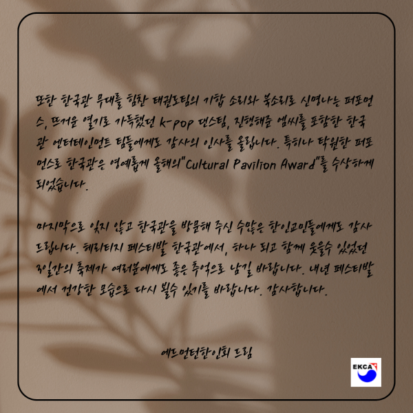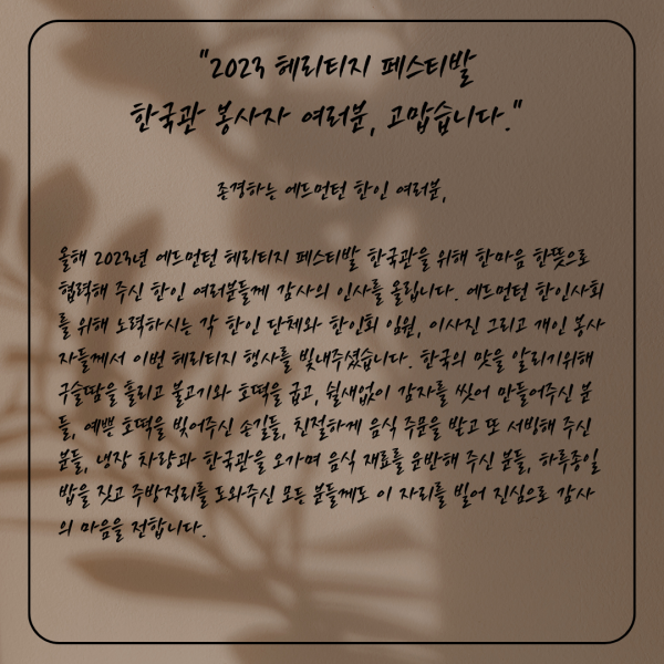 “2023 헤리티지 페스티발-한국관 봉사자 여러분, 고맙습니다.” 작성자 정보 운영자 작성 작성일 2026.04.11 22:31 컨텐츠 정보 38 조회 목록 본문 SNS 공유 관련자료 링크 http://www.edmontonkorean.org/new/2023-%ed%97%a4%eb%a6%ac%ed%8b%b0%ec%a7%80-%ed%8e%98%ec%8a%a4%ed%8b%b0%eb%b0%9c-%ed%95%9c%ea%b5%ad%ea%b4%80-%eb%b4%89%ec%82%ac%ec%9e%90-%ec%97%ac%eb%9f%ac%eb%b6%84-%ea%b3%a0%eb%a7%99%ec%8a%b5/ 15 회 연결 댓글 0 등록된 댓글이 없습니다. 로그인한 회원만 댓글 등록이 가능합니다. 목록
