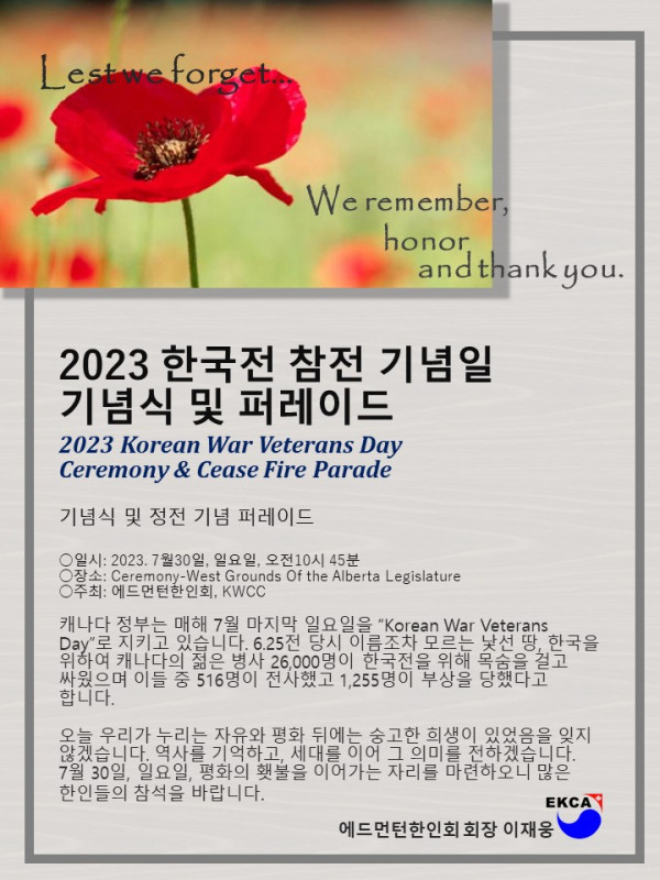 2023 한국전 참전 기념식 및 퍼레이드 행사 안내 작성자 정보 운영자 작성 작성일 2026.04.11 22:31 컨텐츠 정보 50 조회 목록 본문 SNS 공유 관련자료 링크 http://www.edmontonkorean.org/new/2023-%ed%95%9c%ea%b5%ad%ec%a0%84-%ec%b0%b8%ec%a0%84-%ea%b8%b0%eb%85%90%ec%8b%9d-%eb%b0%8f-%ed%8d%bc%eb%a0%88%ec%9d%b4%eb%93%9c-%ed%96%89%ec%82%ac-%ec%95%88%eb%82%b4/ 14 회 연결 댓글 0 등록된 댓글이 없습니다. 로그인한 회원만 댓글 등록이 가능합니다. 목록
