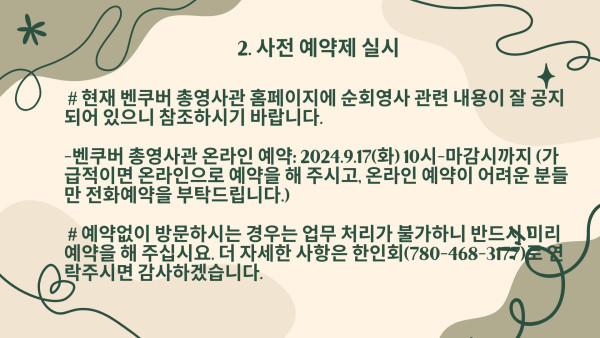 2024년 10월 18일, 주밴쿠버총영사관 순회영사업무 안내 작성자 정보 운영자 작성 작성일 2026.04.11 22:31 컨텐츠 정보 39 조회 목록 본문 SNS 공유 관련자료 링크 http://www.edmontonkorean.org/new/2024%eb%85%84-10%ec%9b%94-18%ec%9d%bc-%ec%a3%bc%eb%b0%b4%ec%bf%a0%eb%b2%84%ec%b4%9d%ec%98%81%ec%82%ac%ea%b4%80-%ec%88%9c%ed%9a%8c%ec%98%81%ec%82%ac%ec%97%85%eb%ac%b4-%ec%95%88%eb%82%b4/ 11 회 연결 댓글 0 등록된 댓글이 없습니다. 로그인한 회원만 댓글 등록이 가능합니다. 목록