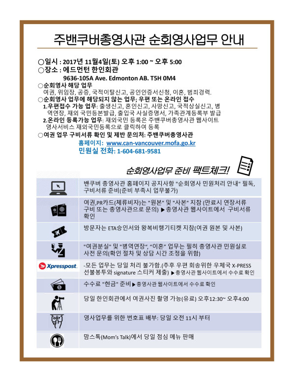 주밴쿠버총영사관의 에드먼턴 지역 순회영사업무에 대해 안내 드립니다.