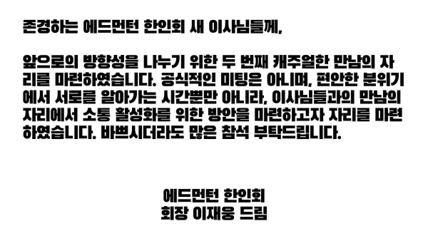 새롭게 선출된 한인회 이사 두번째 모임 및 워크샵 작성자 정보 운영자 작성 작성일 2026.04.11 22:45 컨텐츠 정보 13 조회 목록 본문 SNS 공유 관련자료 링크 http://www.edmontonkorean.org/notification/%ec%83%88%eb%a1%ad%ea%b2%8c-%ec%84%a0%ec%b6%9c%eb%90%9c-%ed%95%9c%ec%9d%b8%ed%9a%8c-%ec%9d%b4%ec%82%ac-%eb%91%90%eb%b2%88%ec%a7%b8-%eb%aa%a8%ec%9e%84-%eb%b0%8f-%ec%9b%8c%ed%81%ac%ec%83%b5/ 7 회 연결 댓글 0 등록된 댓글이 없습니다. 로그인한 회원만 댓글 등록이 가능합니다. 목록