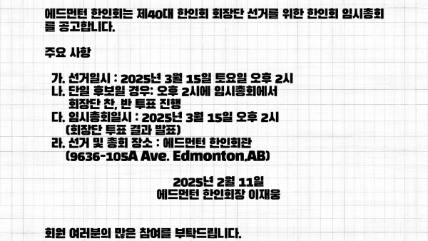 에드먼턴 한인회 임시총회 공고 작성자 정보 운영자 작성 작성일 2026.04.11 22:45 컨텐츠 정보 15 조회 목록 본문 SNS 공유 관련자료 링크 http://www.edmontonkorean.org/notification/%ec%97%90%eb%93%9c%eb%a8%bc%ed%84%b4-%ed%95%9c%ec%9d%b8%ed%9a%8c-%ec%9e%84%ec%8b%9c%ec%b4%9d%ed%9a%8c-%ea%b3%b5%ea%b3%a0/ 5 회 연결 댓글 0 등록된 댓글이 없습니다. 로그인한 회원만 댓글 등록이 가능합니다. 목록