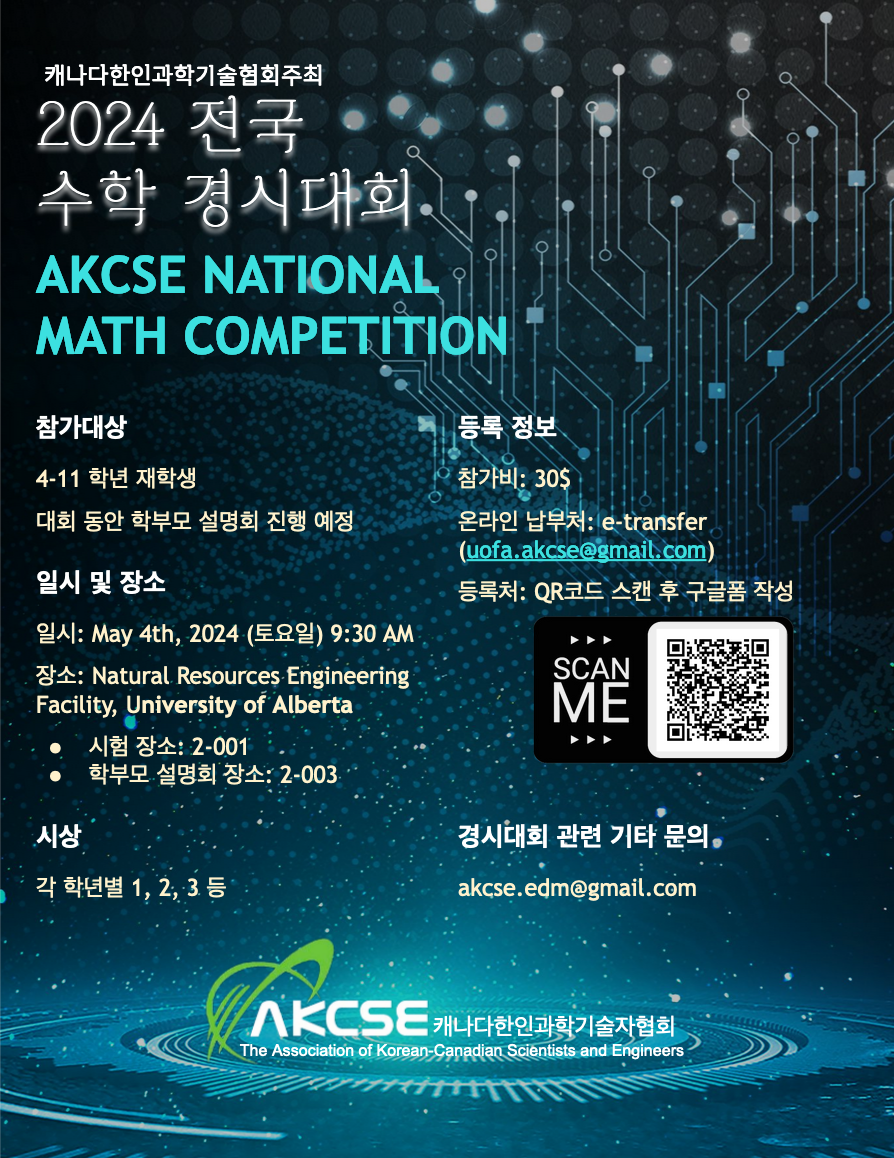 캐나다 한인 과학 기술자 협회 (AKCSE) Central Alberta (Edmonton) 지부가 한인 교민분들의 위해 알버타 수학 경시대회를 진행하게 되었습니다.
