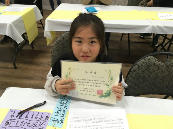 붓펜 글쓰기대회에서 많은 어린이들이 상을 받았는데 수상자뿐 아니라 모든 참가 학생들이 토요일 한때 붓펜이라는 한국적 분위기가 물씬 나는 필기도구를 통해 한글사랑을 체험해 보는 뜻깊은 기회를 가졌다는 것이 더 큰 상으로 남는 시간이었다. 심사에는 조율리 에드먼턴 얼음꽃문학회장겸 도서관장과 문학회 이사회 장인영 이사께서 수고해 주셨다.