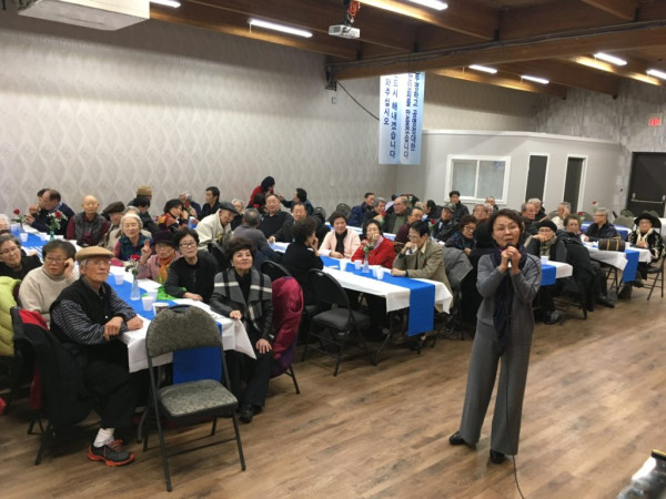 에드먼턴 한인 노인회(회장 이옥자)에서는 지난 12월 7일 다운타운 한인회관 대강당에서 2019년 송년잔치를 개최했다. 행사 당일 이른 아침부터 내린 눈으로 참여도에 문제가 생기는 것 아닌가 하는 조바심을 재우듯 130명이 넘는 회원들의 열화같은 참여에 행사장 준비좌석은 남김없이 채워졌다. 가평전투 참전약장(사진 파란색 장방형 배너) 를 패용한 Lyle Mcivor 씨를 비롯한 다수의 KVA(Korea War Veterans Association) 회원들도 참석해 자리를 빛내 주었다.