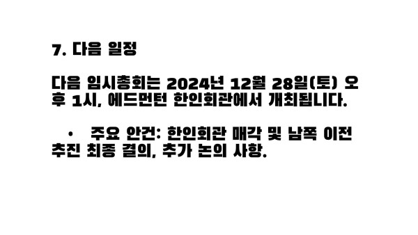 2024년 12월 7일 에드먼턴 한인회 임시총회 결과 보고 작성자 정보 운영자 작성 작성일 2026.04.11 22:31 컨텐츠 정보 29 조회 목록 본문 SNS 공유 관련자료 링크 http://www.edmontonkorean.org/new/2024%eb%85%84-12%ec%9b%94-7%ec%9d%bc-%ec%97%90%eb%93%9c%eb%a8%bc%ed%84%b4-%ed%95%9c%ec%9d%b8%ed%9a%8c-%ec%9e%84%ec%8b%9c%ec%b4%9d%ed%9a%8c-%ea%b2%b0%ea%b3%bc-%eb%b3%b4%ea%b3%a0/ 10 회 연결 댓글 0 등록된 댓글이 없습니다. 로그인한 회원만 댓글 등록이 가능합니다. 목록