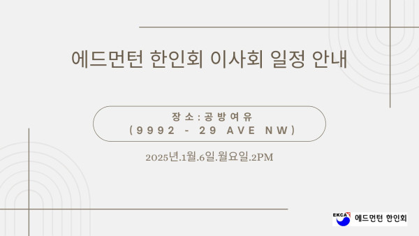2025.1.6. 한인회 이사회 일정 안내 작성자 정보 운영자 작성 작성일 2026.04.11 22:31 컨텐츠 정보 39 조회 목록 본문 SNS 공유 관련자료 링크 http://www.edmontonkorean.org/new/2025-1-6-%ed%95%9c%ec%9d%b8%ed%9a%8c-%ec%9d%b4%ec%82%ac%ed%9a%8c-%ec%9d%bc%ec%a0%95-%ec%95%88%eb%82%b4/ 13 회 연결 댓글 0 등록된 댓글이 없습니다. 로그인한 회원만 댓글 등록이 가능합니다. 목록