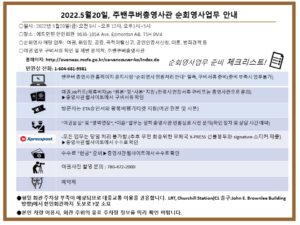 5월 20일 주밴쿠버 총영사관 영사업무 안내 작성자 정보 운영자 작성 작성일 2026.04.11 22:31 컨텐츠 정보 36 조회 목록 본문 SNS 공유 관련자료 링크 http://www.edmontonkorean.org/new/5%ec%9b%94-20%ec%9d%bc-%ec%a3%bc%eb%b0%b4%ec%bf%a0%eb%b2%84-%ec%b4%9d%ec%98%81%ec%82%ac%ea%b4%80-%ec%98%81%ec%82%ac%ec%97%85%eb%ac%b4-%ec%95%88%eb%82%b4/ 13 회 연결 댓글 0 등록된 댓글이 없습니다. 로그인한 회원만 댓글 등록이 가능합니다. 목록