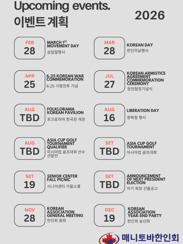 안녕하세요, 매니토바 한인회입니다.주토론토총영사관과 재외동포청 주관으로 **「통합민원서비스 온라인 화상상담회」**가 아래와 같이 개최될 예정이오니, 관심 있는 교민 여러분의 많은 참여를 바랍니다. 행사 개요일시: 2026년 2월 11일(수) 오후 7시 30분방식: 온라...